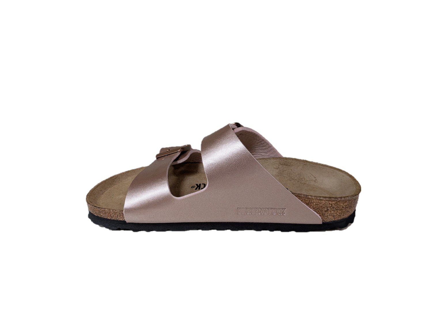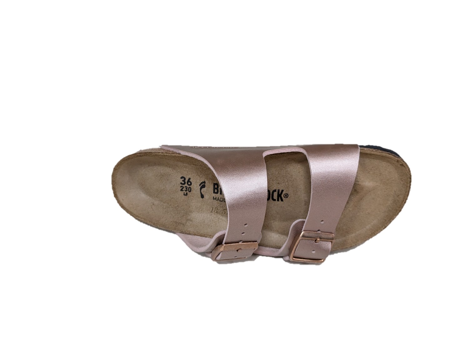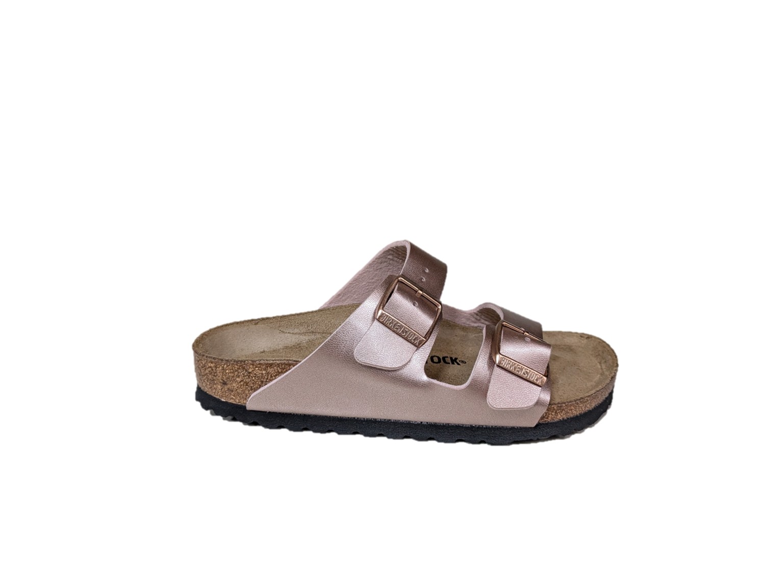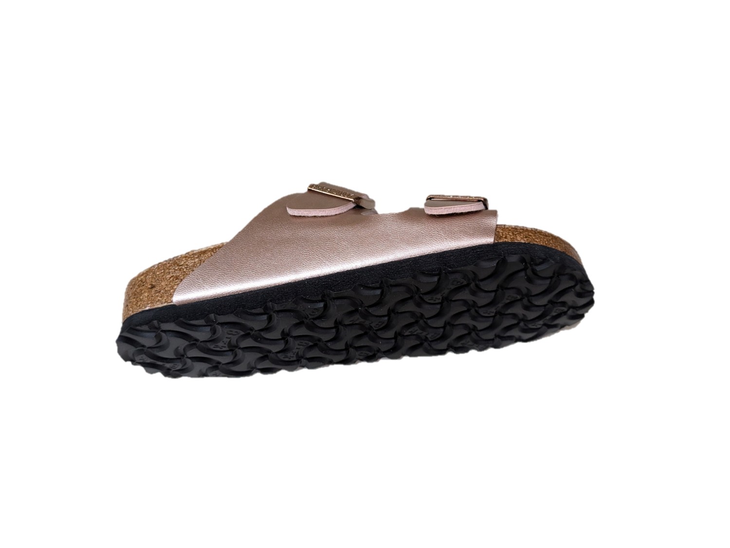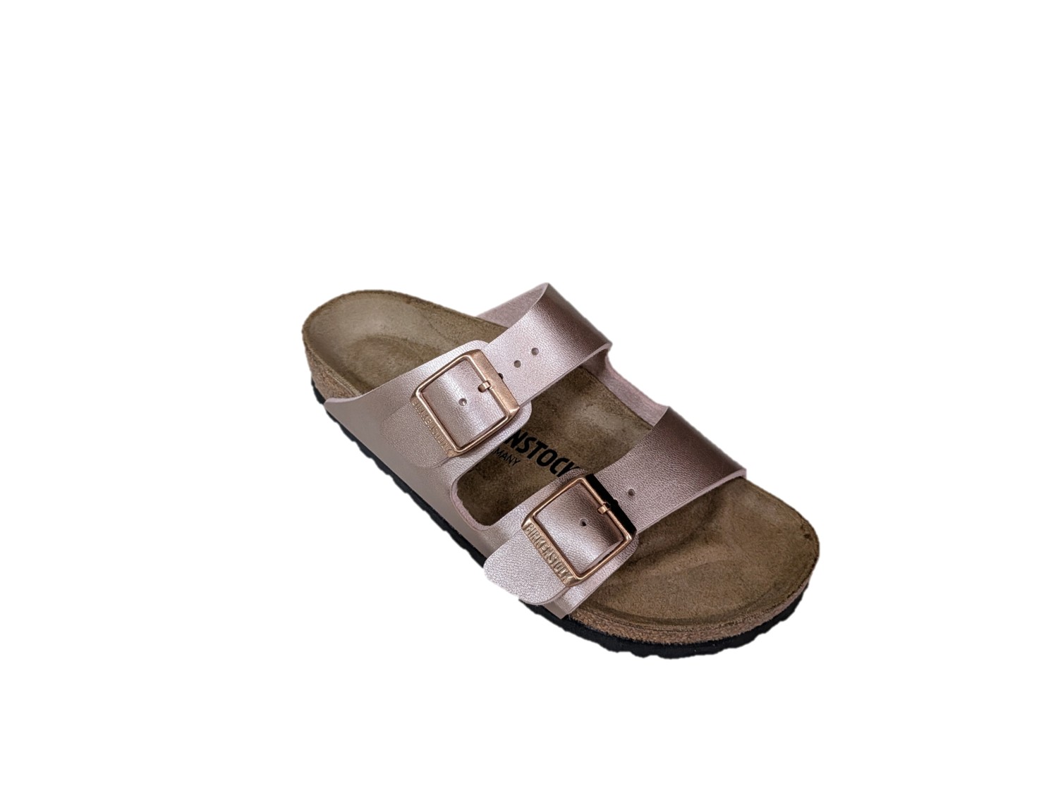 Ciabatta con tomaia in birko-flor, sottopiede birkenstock, allacciatura con la doppia fibbia, calzatura stretta