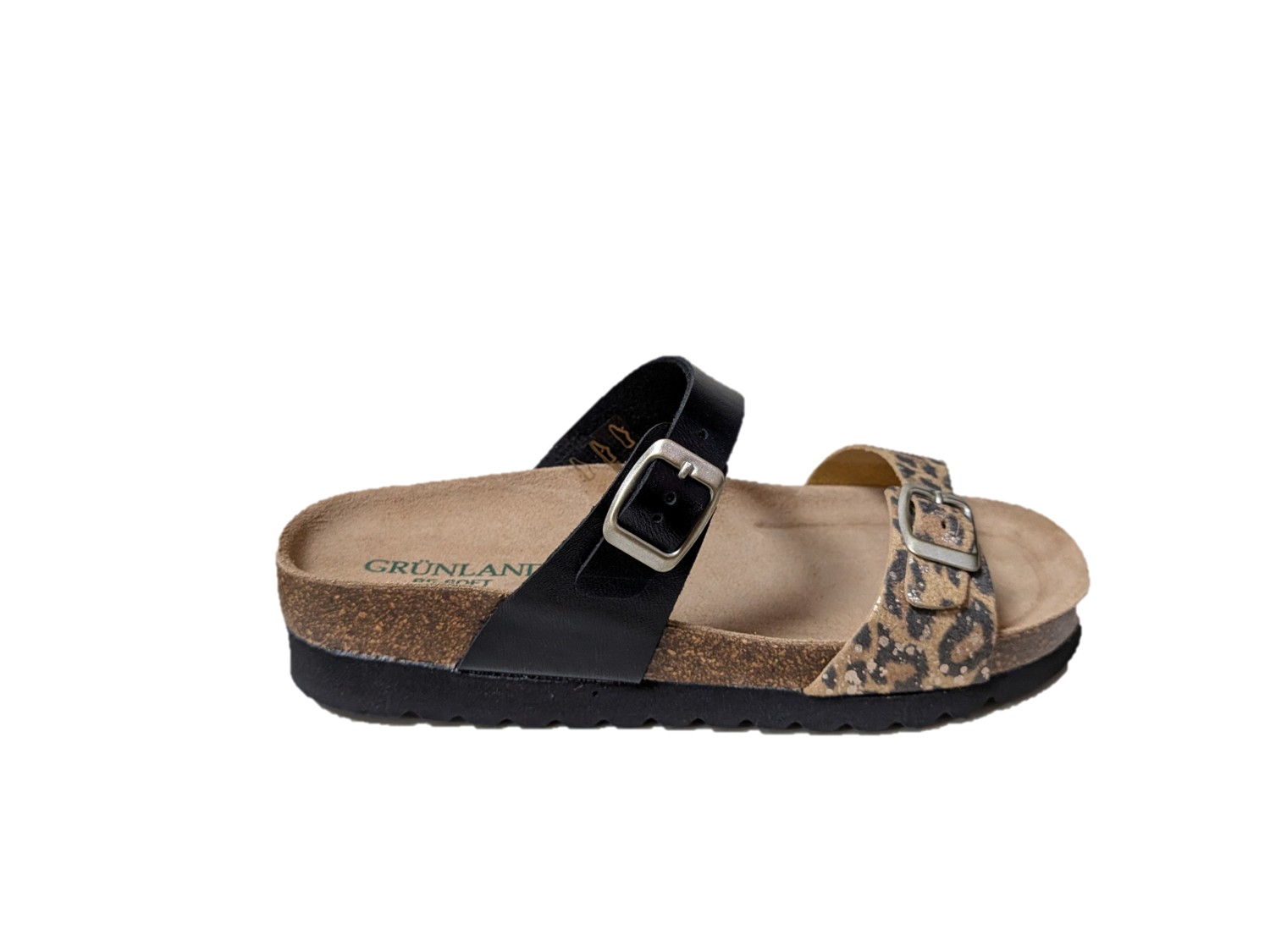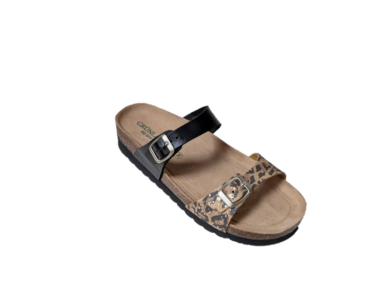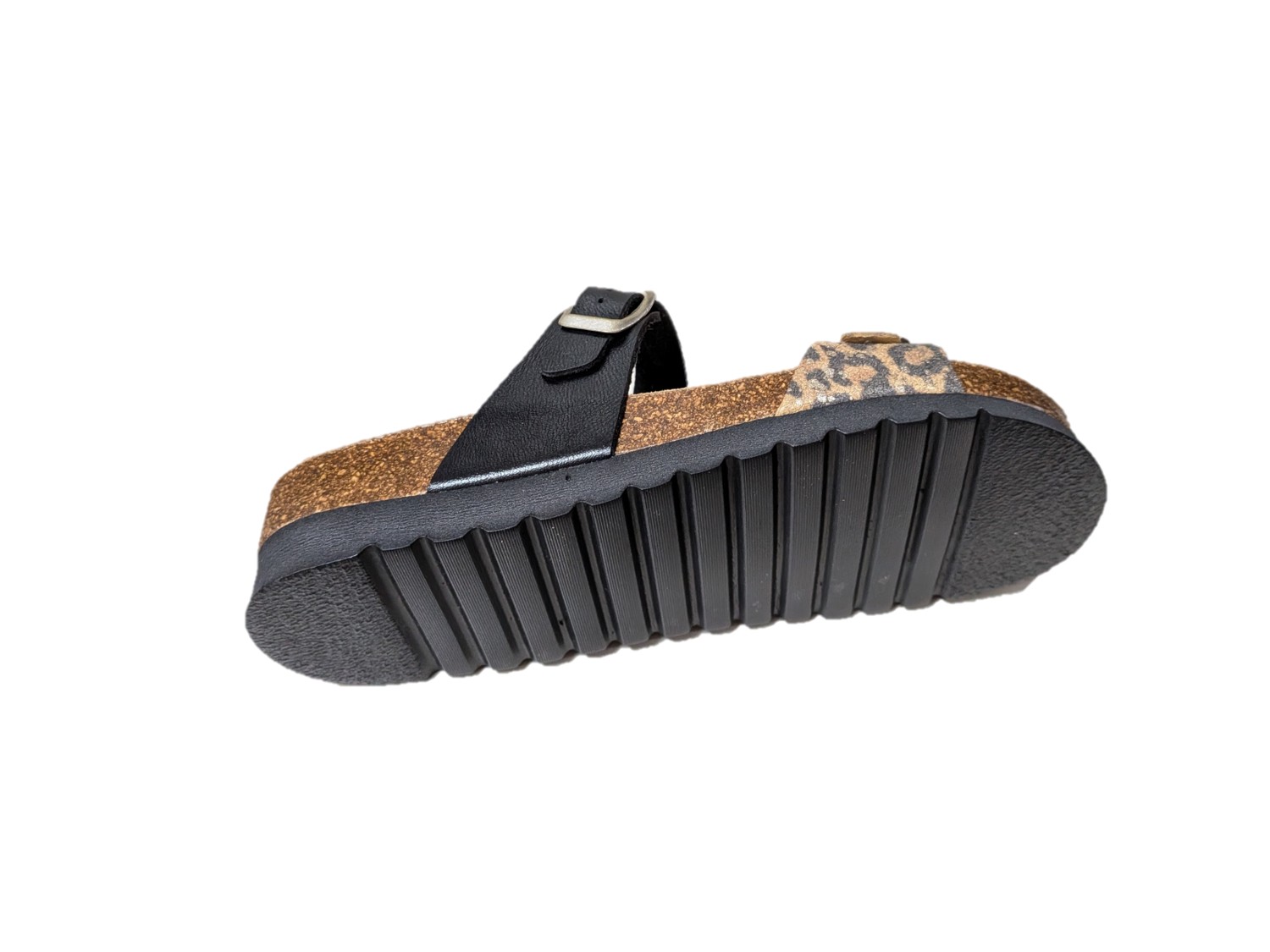 Ciabatta con tomaia in sintetico, colori nero e multi, sottopiede sughero, re-soft, pelle, suola in eva