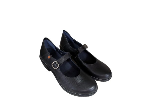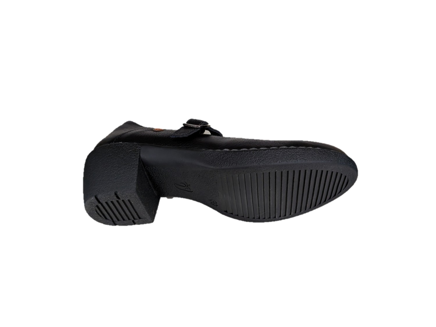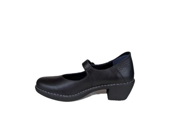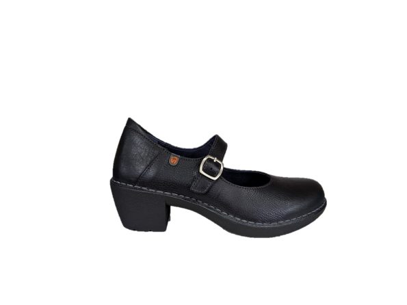 Scarpa comoda in pelle colore nero, tacco 5,5cm, suola in gomma, fodera in sintetico, allacciatura con la fibbia