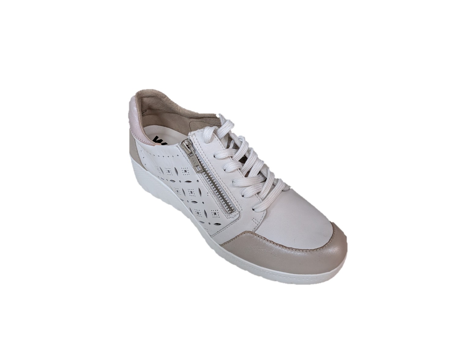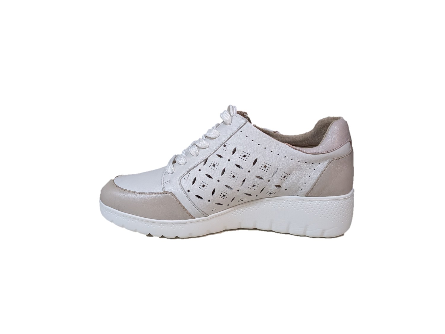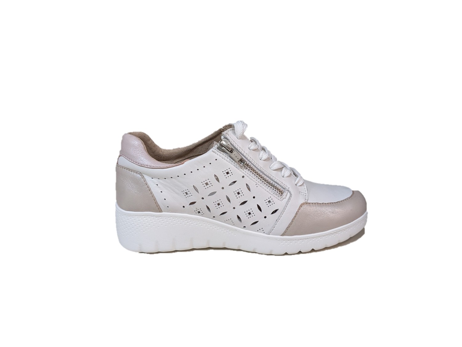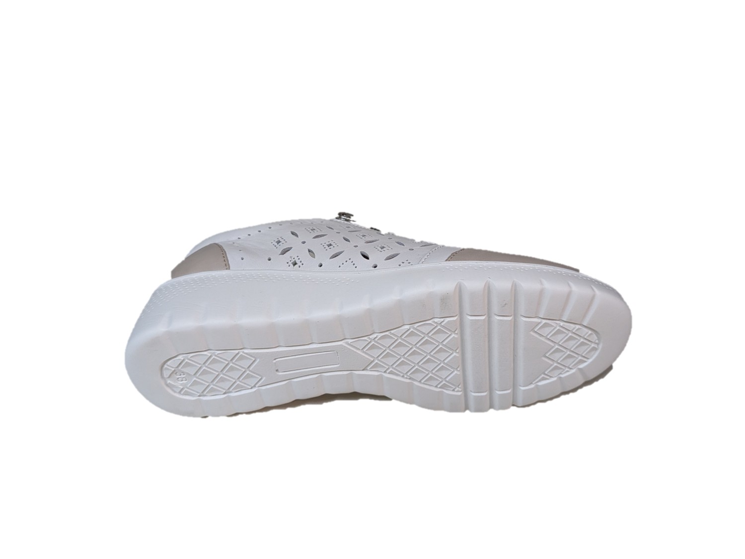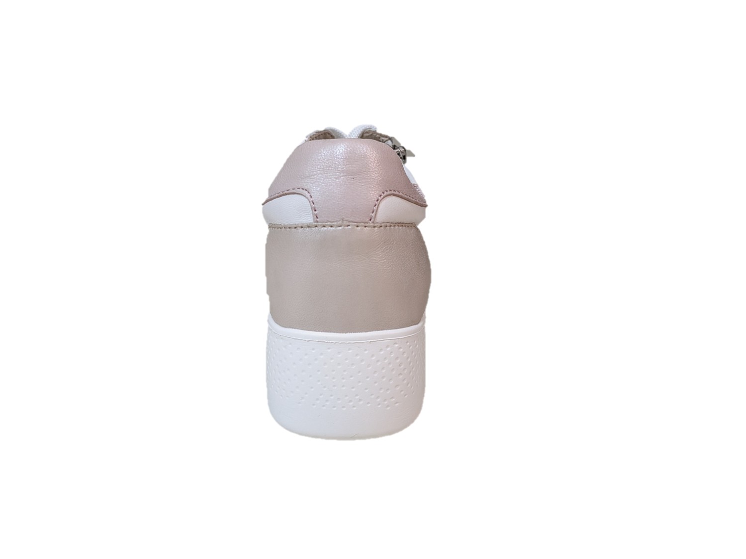 Sneakers in pelle colori bianco e taupe, suola in gomma, zeppa di 4cm, sottopiede estraibile.