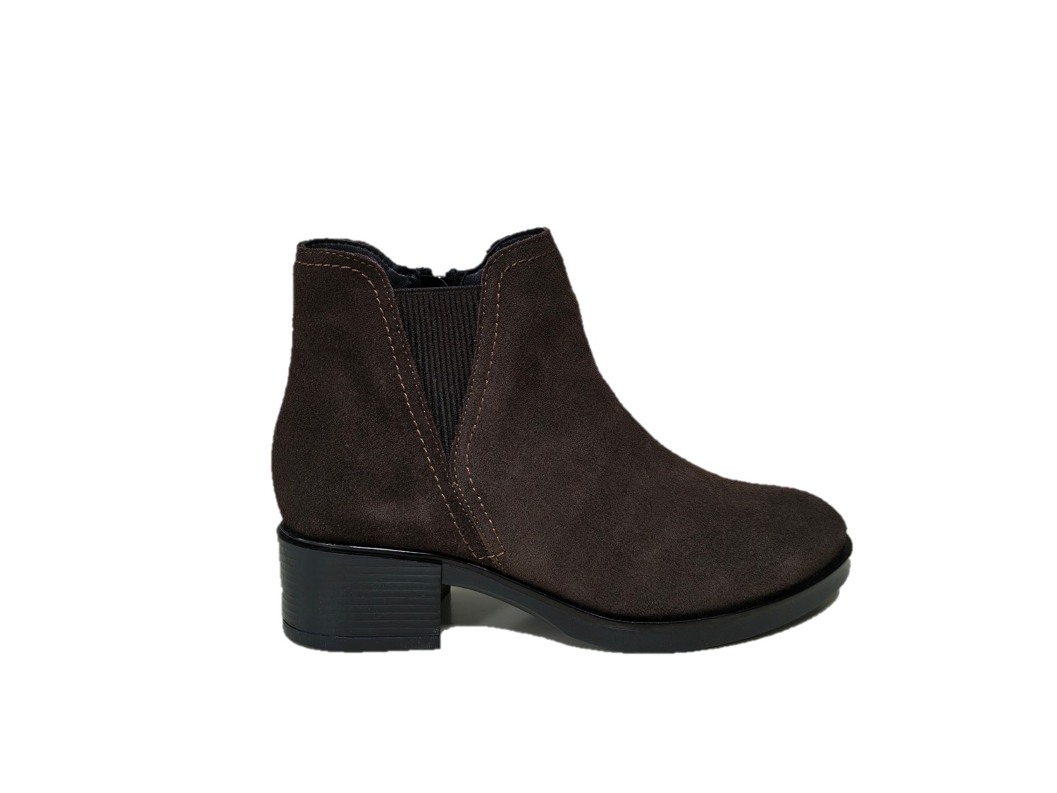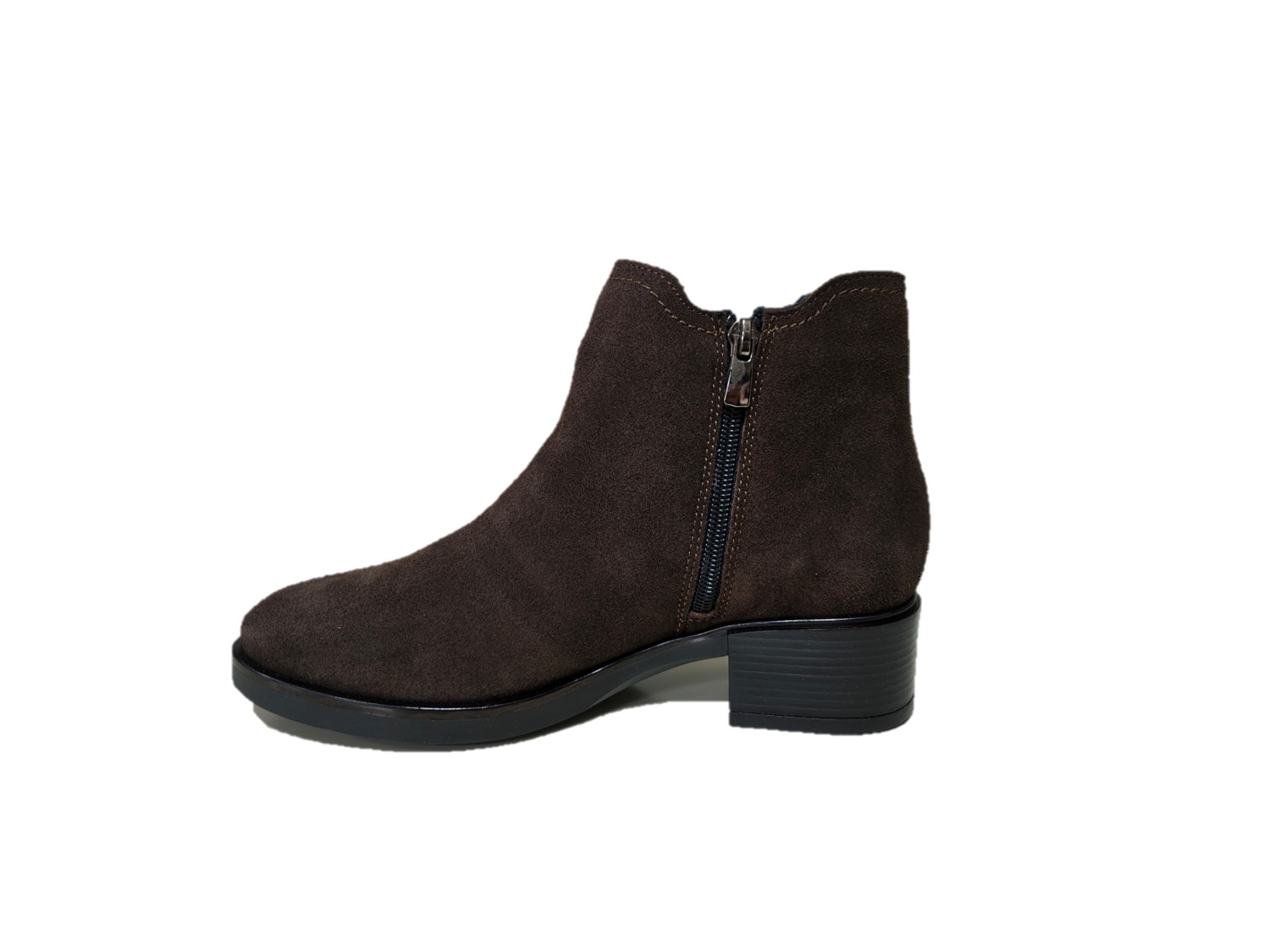 Stivaletti in pelle scamosciata colore marrone, tacco 4cm, suola in gomma, cerniera laterale