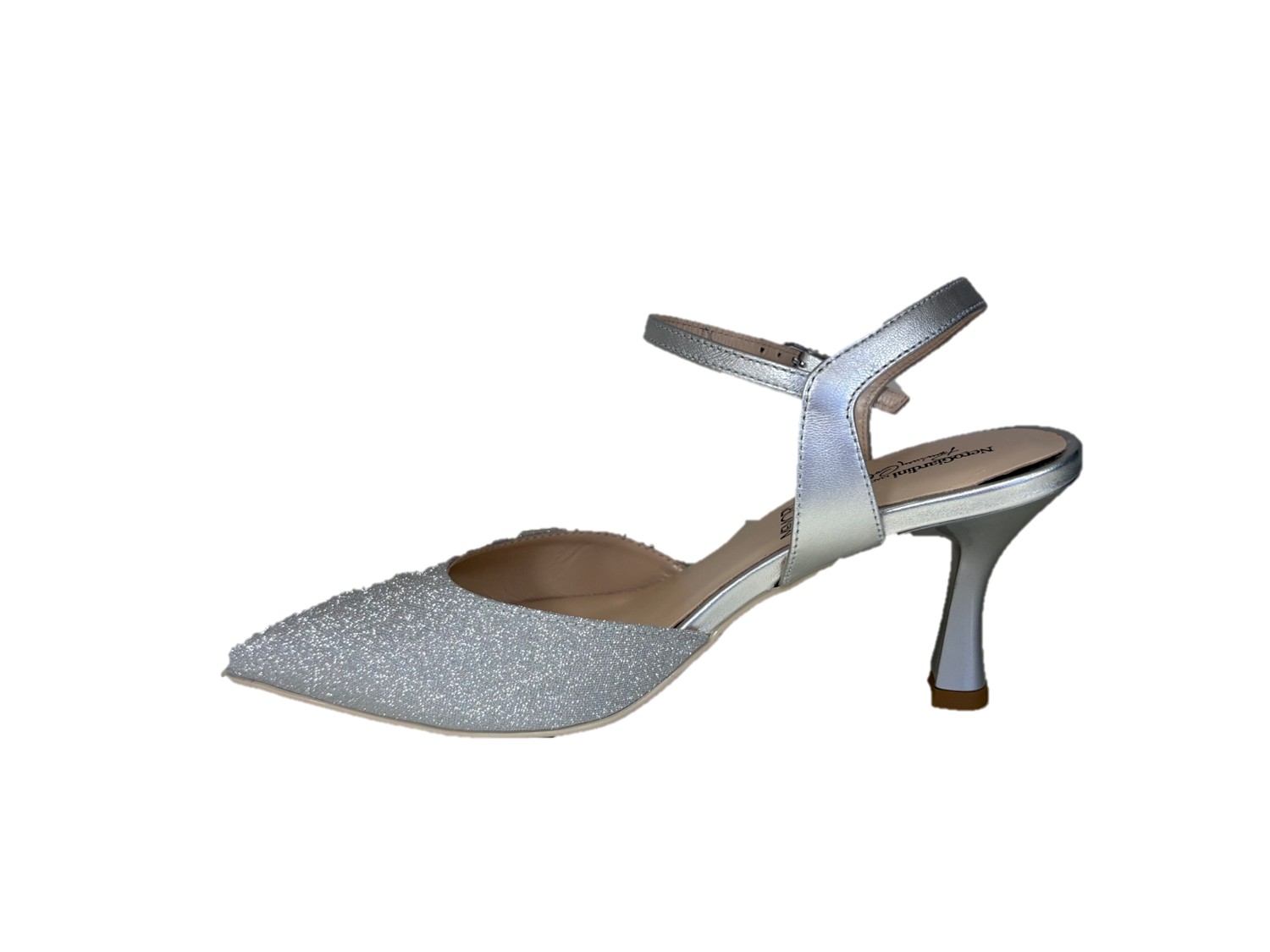 Slingback con tomaia in pelle e tessuto laminato colore argento, tacco 7cm, suola in gomma, made in Italy