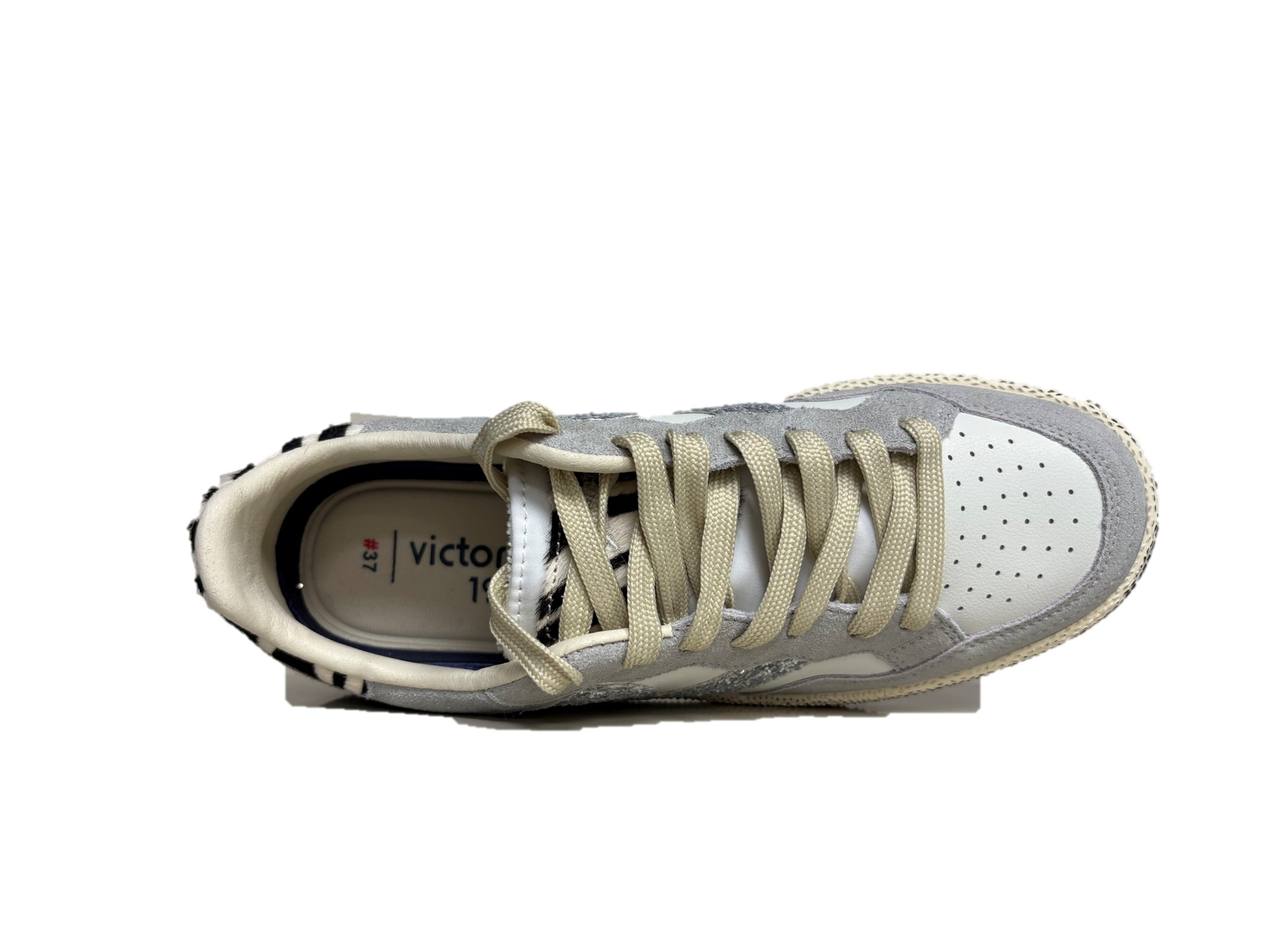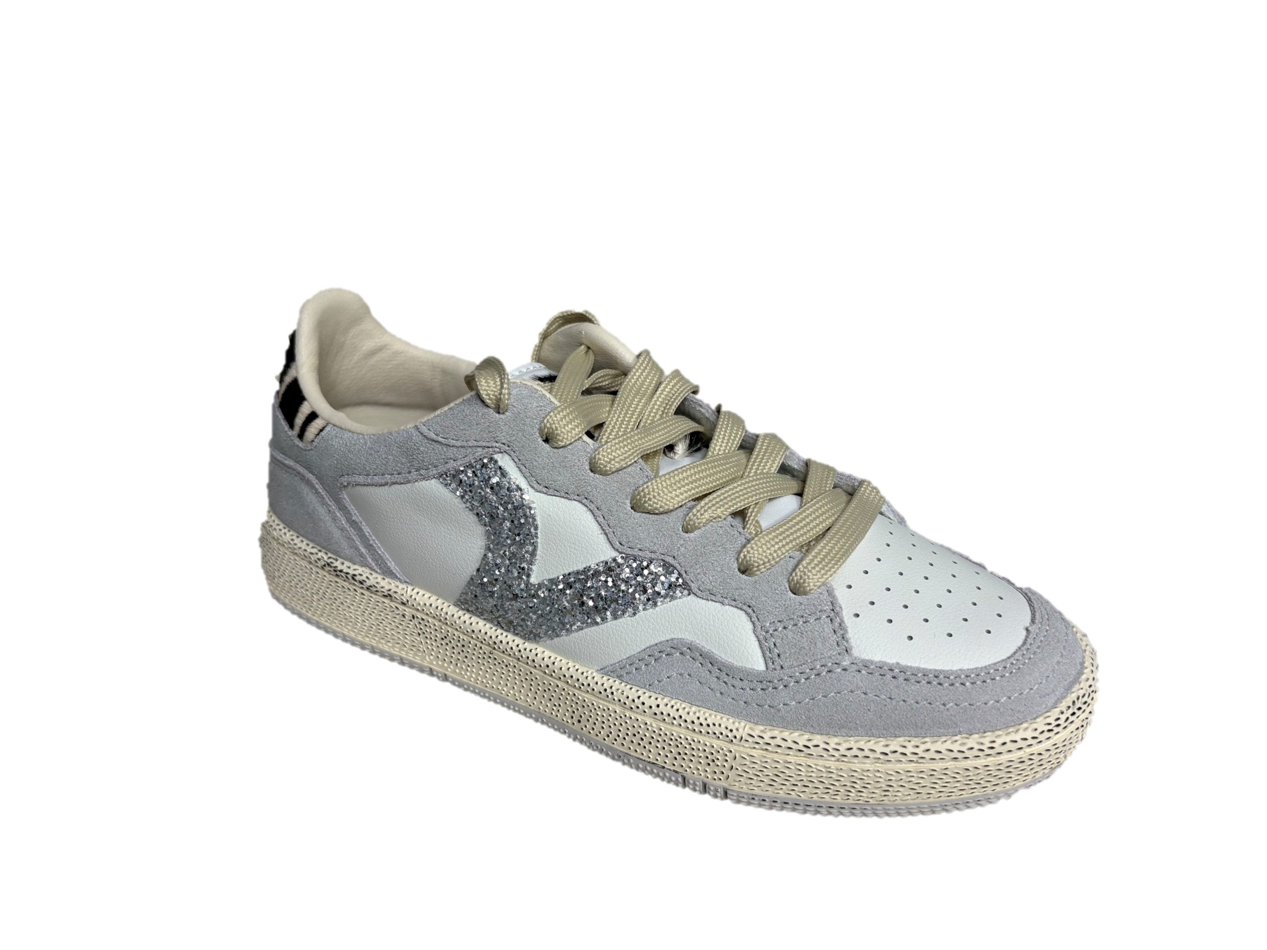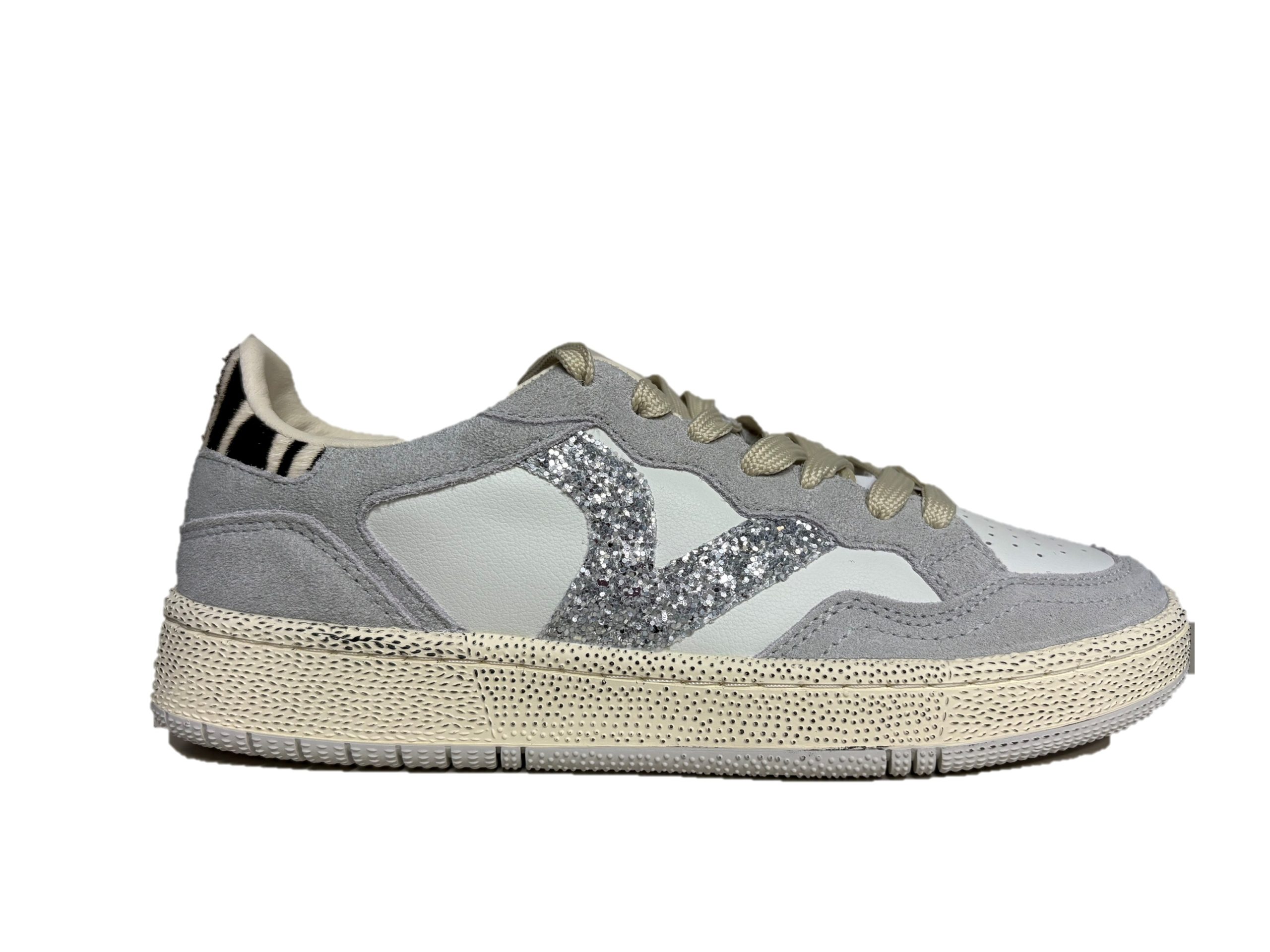 Scarpe sportive da donna realizzate in pelle con inserti in PU. V retro di victoria laterale e parte posteriore in combinazioni di glitter e animal print. Chiusura con lacci bicolore: alcuni tono su tono e altri colorati con ricamo bianco. Fodera in microfibra traspirante. Suola bicolore in gomma con finitura invecchiata e texture rugosa. Include inoltre una soletta ergonomica che si adatta alla forma del piede, offrendo una sensazione di comfort.