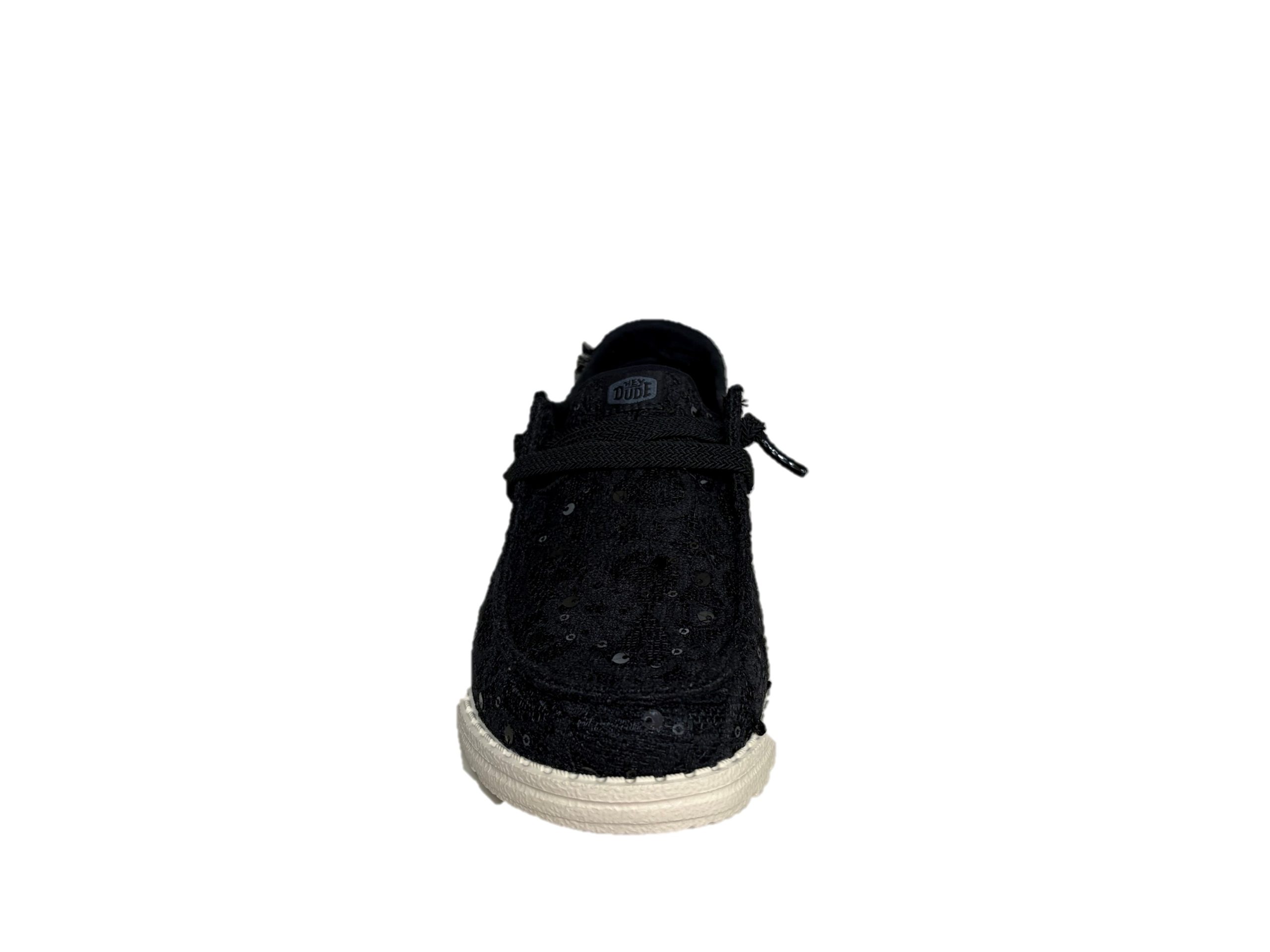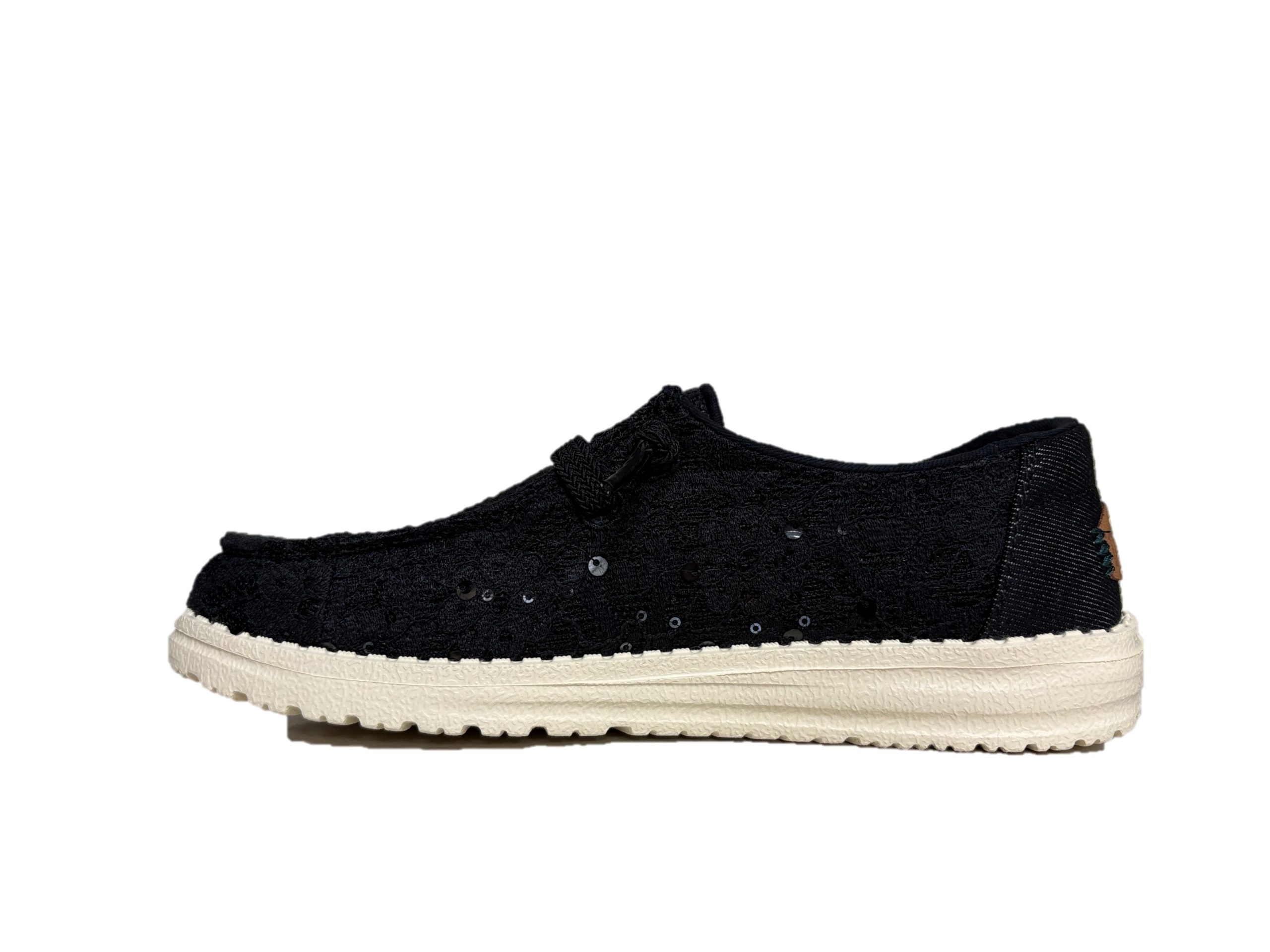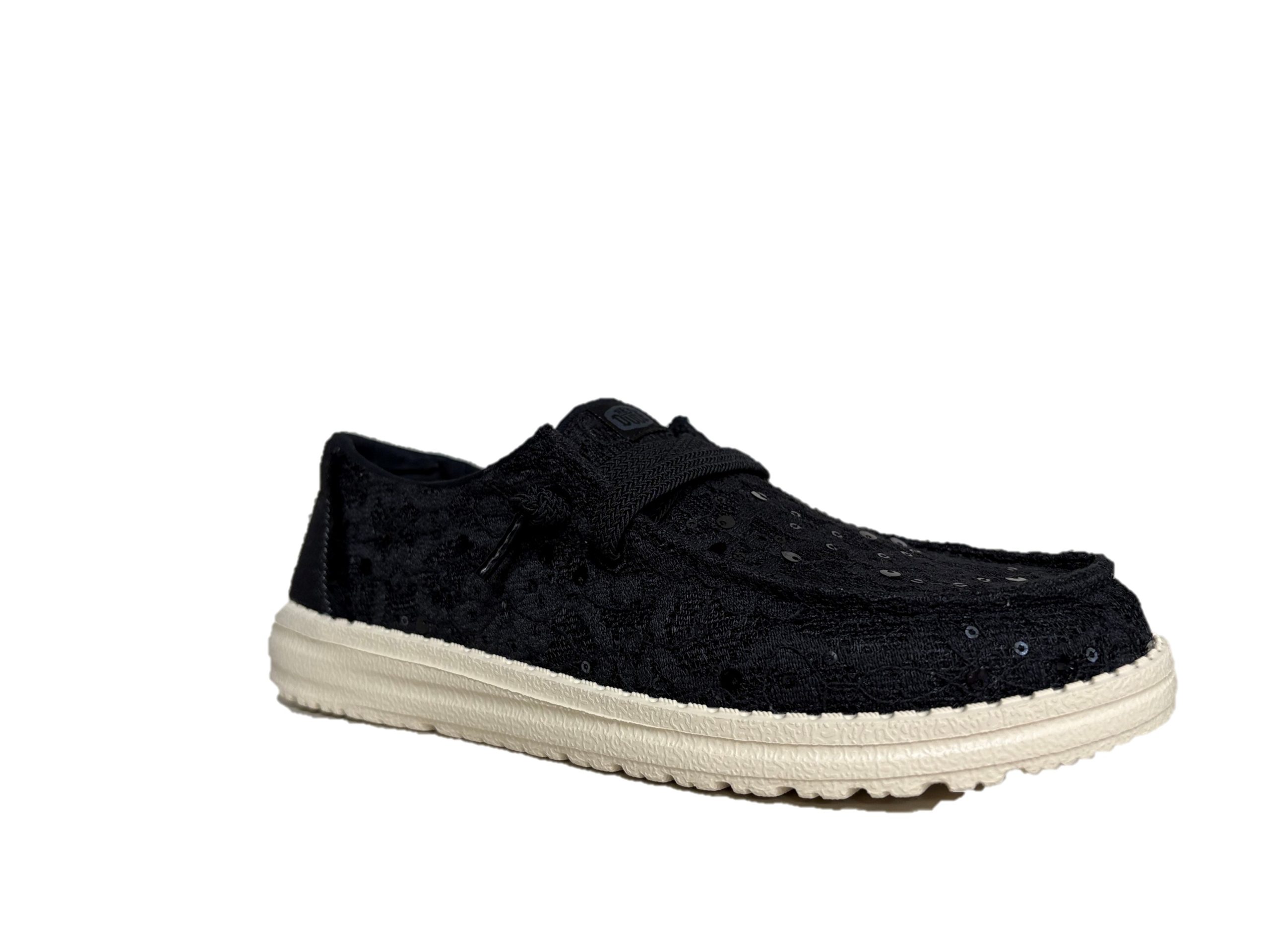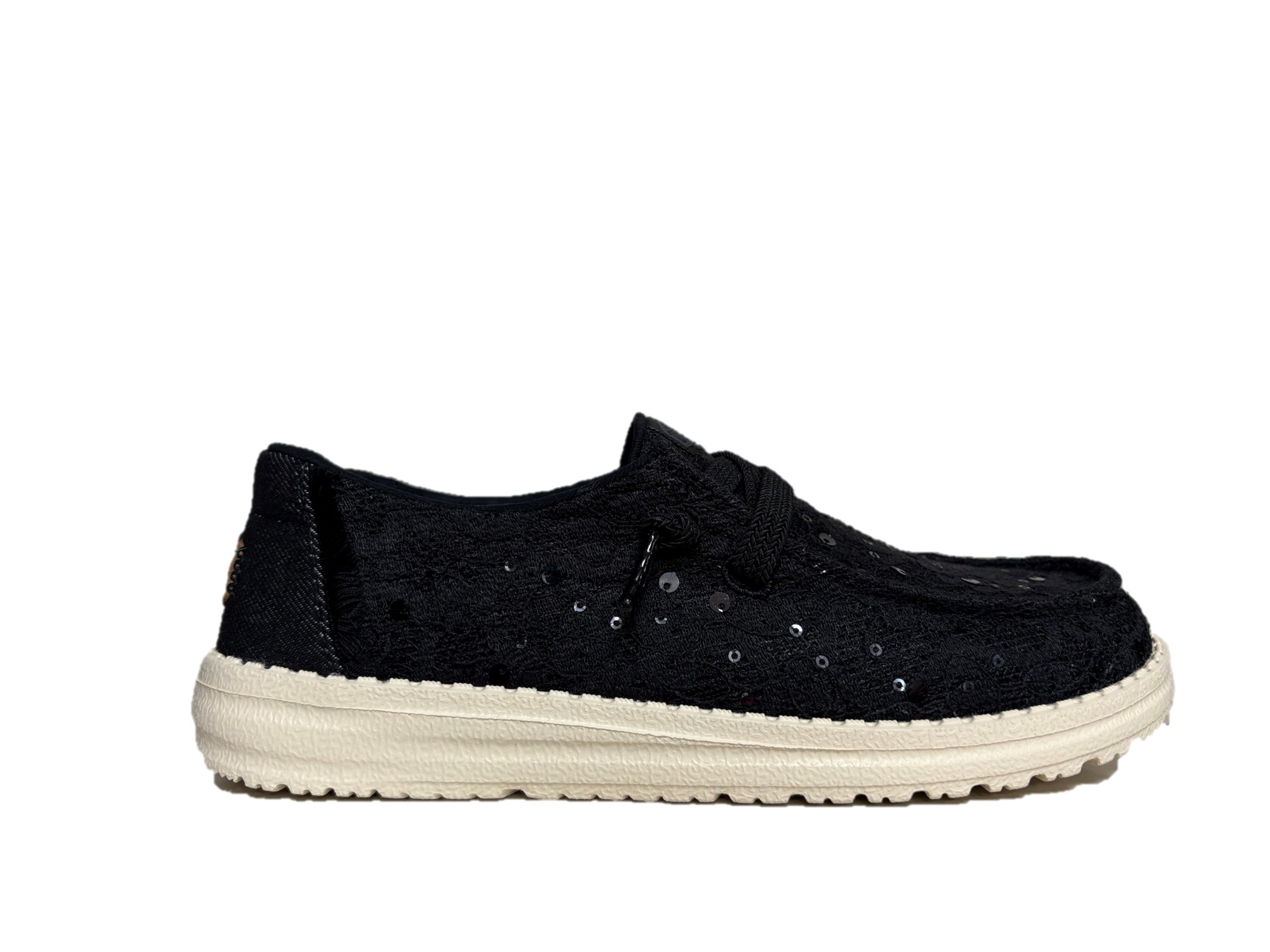 - Tomaia in tessuto con lacci intrecciati e paillettes